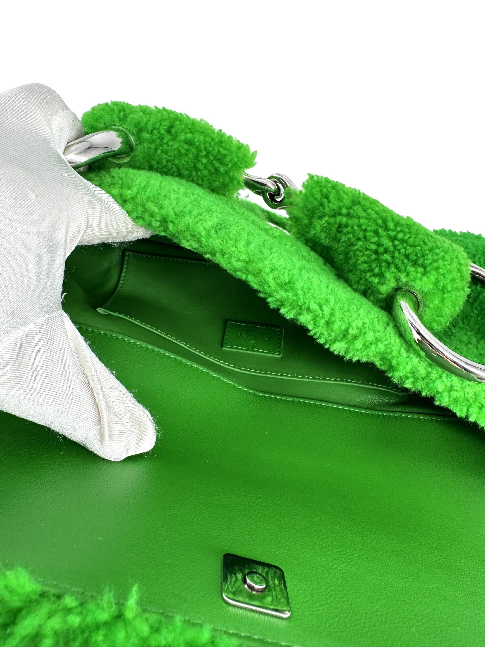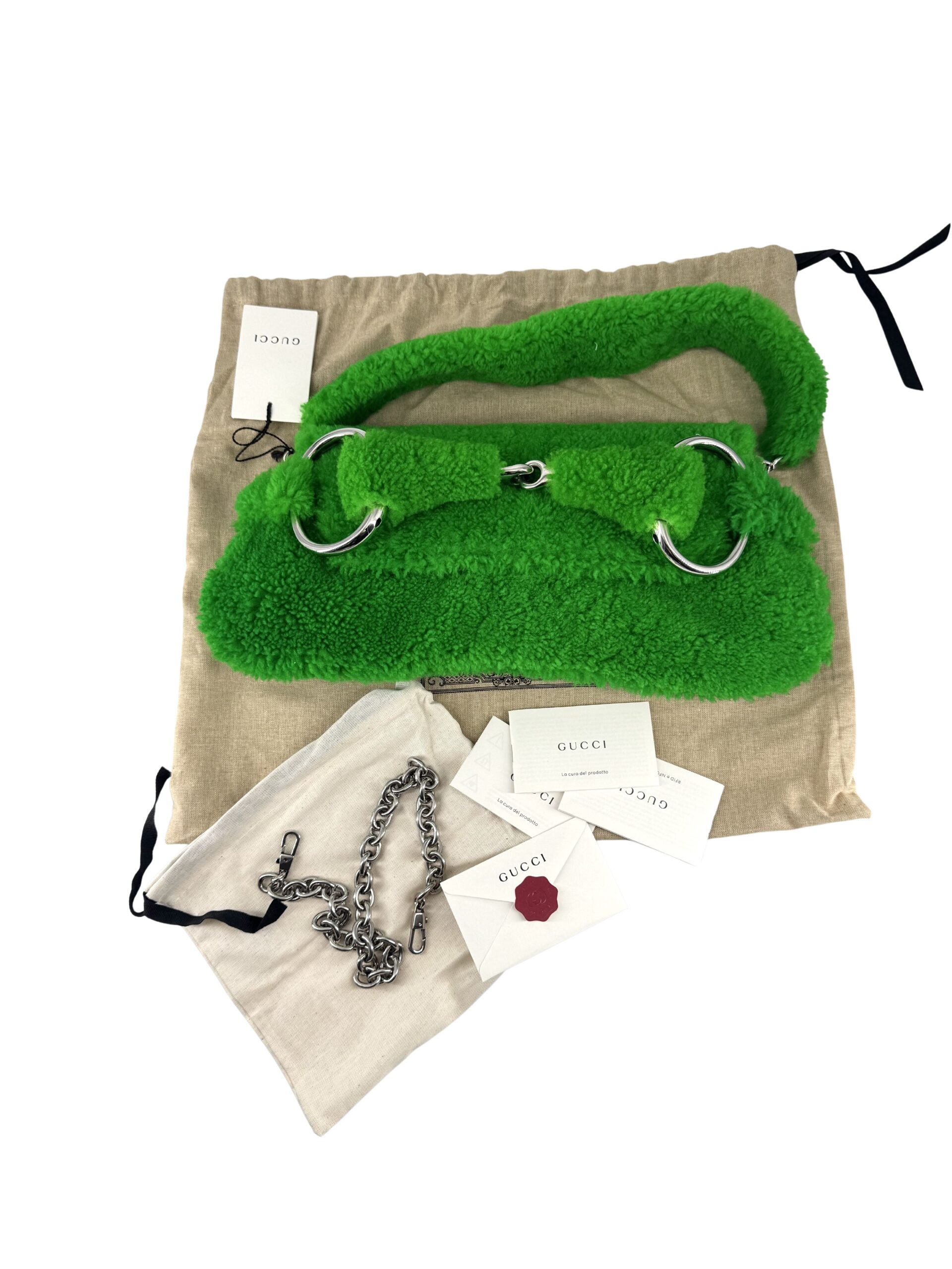 Imbued with a rich legacy of Italian craftsmanship, the Gucci Horsebit Handbag in a vibrant green hue is a testament to the brand’s iconic design ethos. Crafted from luxurious fabric, it seamlessly marries practicality with opulence, making it an essential accessory for the discerning fashion aficionado. Its elegant silhouette, measuring 38 cm in width and 18 cm in height, reflects the meticulous attention to detail synonymous with Gucci, while the signature horsebit motif pays homage to the house’s equestrian heritage. This handbag is not just a statement piece; it embodies a timeless allure, perfect for any occasion. With its pristine condition and included dustbag and authentication cards, the Gucci Horsebit Handbag invites you to experience the intersection of luxury and everyday sophistication.